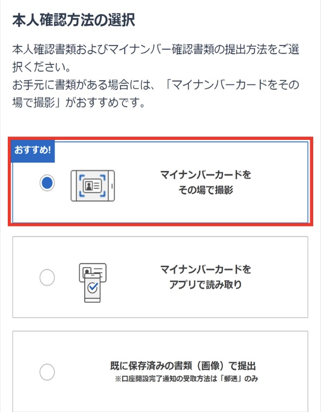 ・本人確認書類の提出方法→「マイナンバーカードをその場で撮影」がおすすめです。